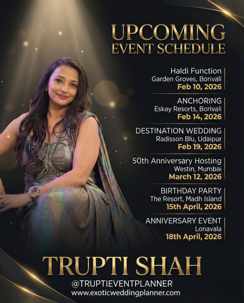 Exotic Wedding Planner was founded by ace Wedding Choreographer Trupti Lalwani. Trupti has done over 500 weddings, corporate shows, events, dance workshops, and motivational sessions in the last 10 years across the world. She has been featured in Times of India, National Geographic Magazine, ZEE TV, and Kabel1 Channel in Germany.